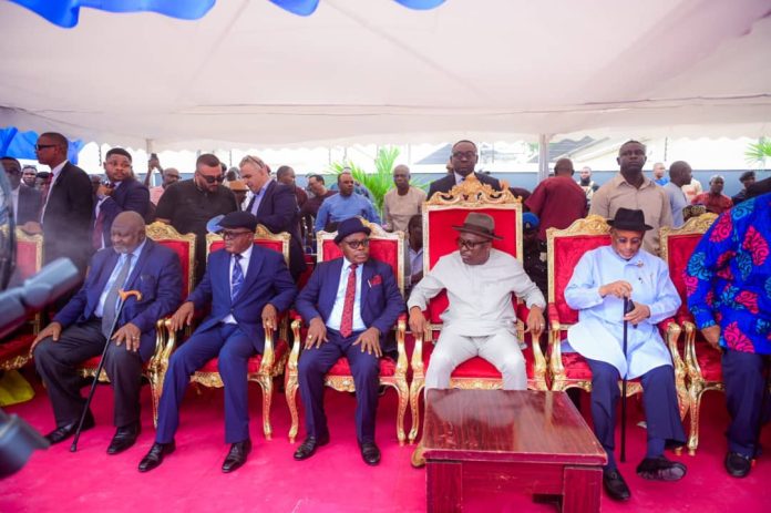Rivers State Governor, Sir Siminalayi Fubara (2nd right); Chief Judge of Rivers State, Justice Simeon Chibuzor Amadi (middle); and former President of Nigerian Bar Association (NBA), O. C. J. Okocha (2nd left); and others chatting during the official commissioning of residential quarters for judges in the State at Old GRA, Port Harcourt on Tuesday