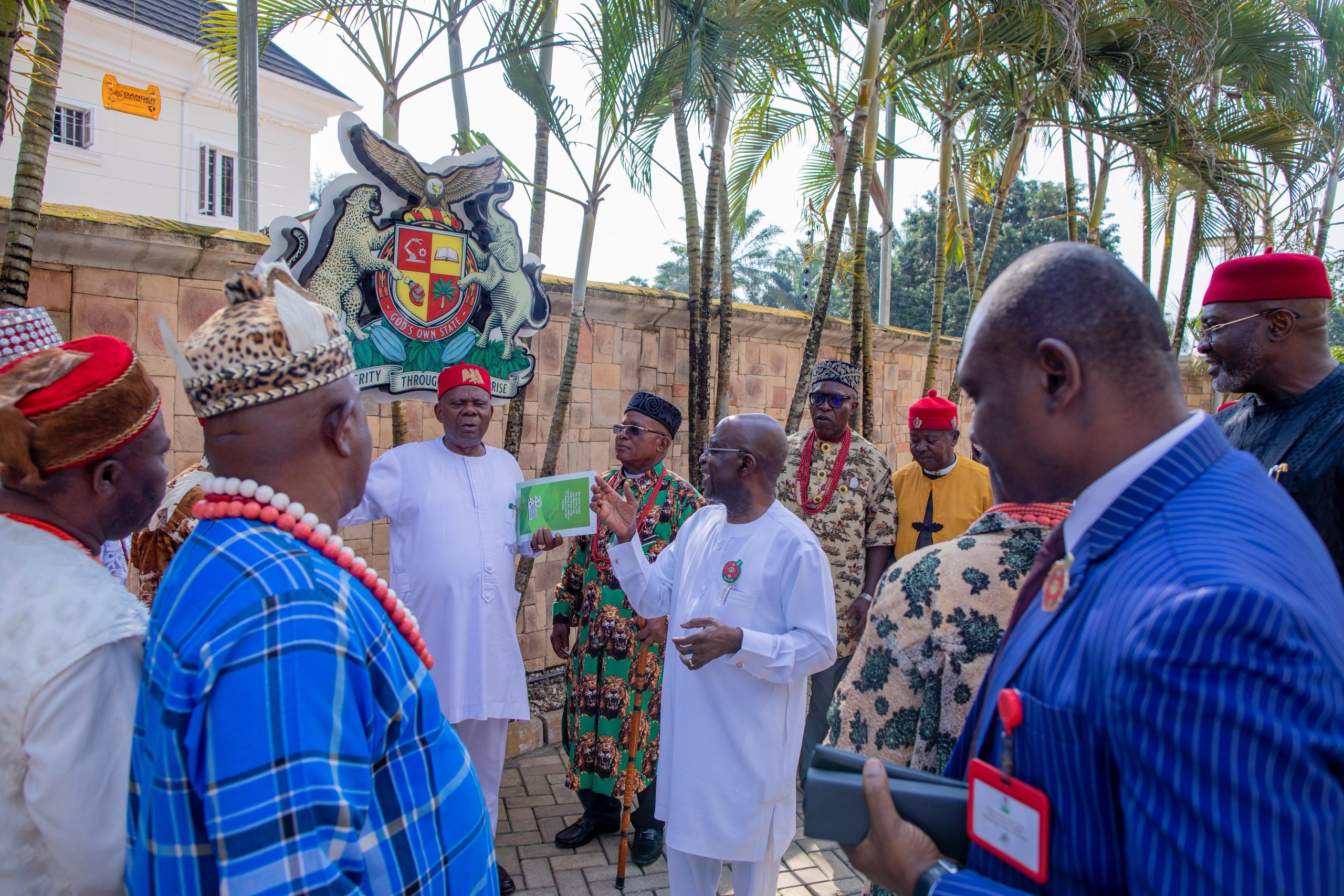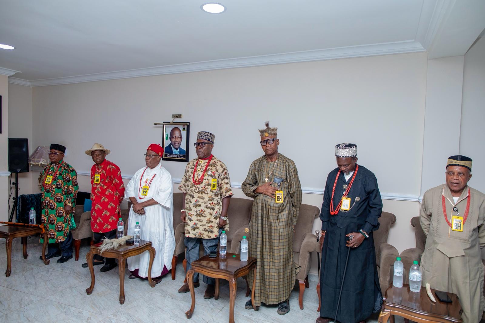The Governor was joined by the Member representing Isiala Ngwa South and North in the House of Representatives, Hon. Okenze Ginger Onwusibe and the Chief of Staff to the Governor, Pastor Caleb Ajagba, to receive the royal fathers.