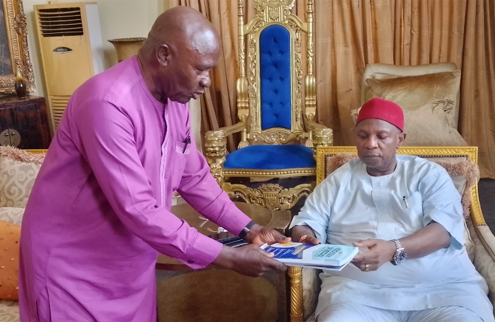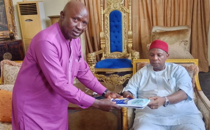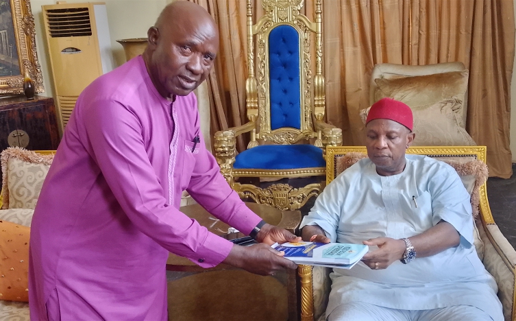 Eze Ilomuanya (seated) receives a letter conveying the award and copy of the 2nd edition, Igbo Book of Records at his Owerri residence, from  Mike Ubani, Executive Director, Hall of Igbo Achievers Foundation.