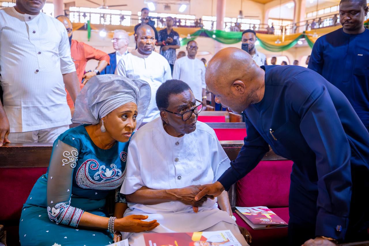 Gov. Mbah greets ex-Governor of old Anambra state, Chief Jim Nwobodo and wife Patricia at the event